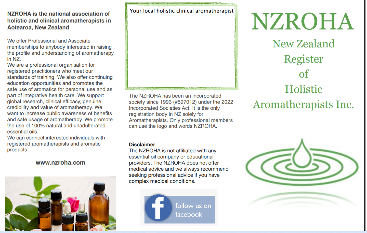 The NZ Register of Holistic Aromatherapists (NZROHA) is New Zealand's only professional aromatherapy practitioner organisation and is a respected voice in the field of integrative aromatic health care.